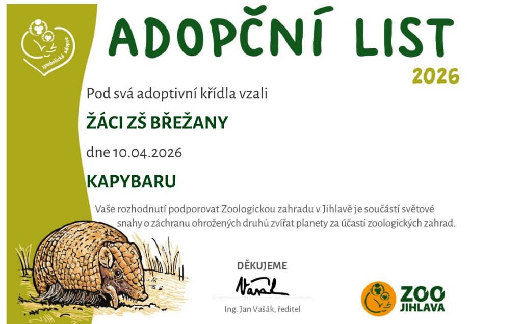 V měsíci dubnu jsme se zapojili do projektu na podporu zvířat. Společně jsme se rozhodli pomoci obyvatelům Zoo Jihlava a vybrali si k adopci oblíbenou kapybaru – největšího hlodavce na světě. Velké poděkování patří všem rodičům i žákům, kteří se do sbírky zapojili, díky těmto příspěvkům se podařilo vybrat potřebnou částku na adopci. Žáci tak měli jedinečnou možnost stát se „adoptivními rodiči“ zvířete a symbolicky přispět na jeho péči, krmení a celkové zázemí v zoo. Kapybaru jsme společně „vzali pod svá křídla“ na jeden rok a máme velkou radost, že jsme mohli podpořit dobrou věc.